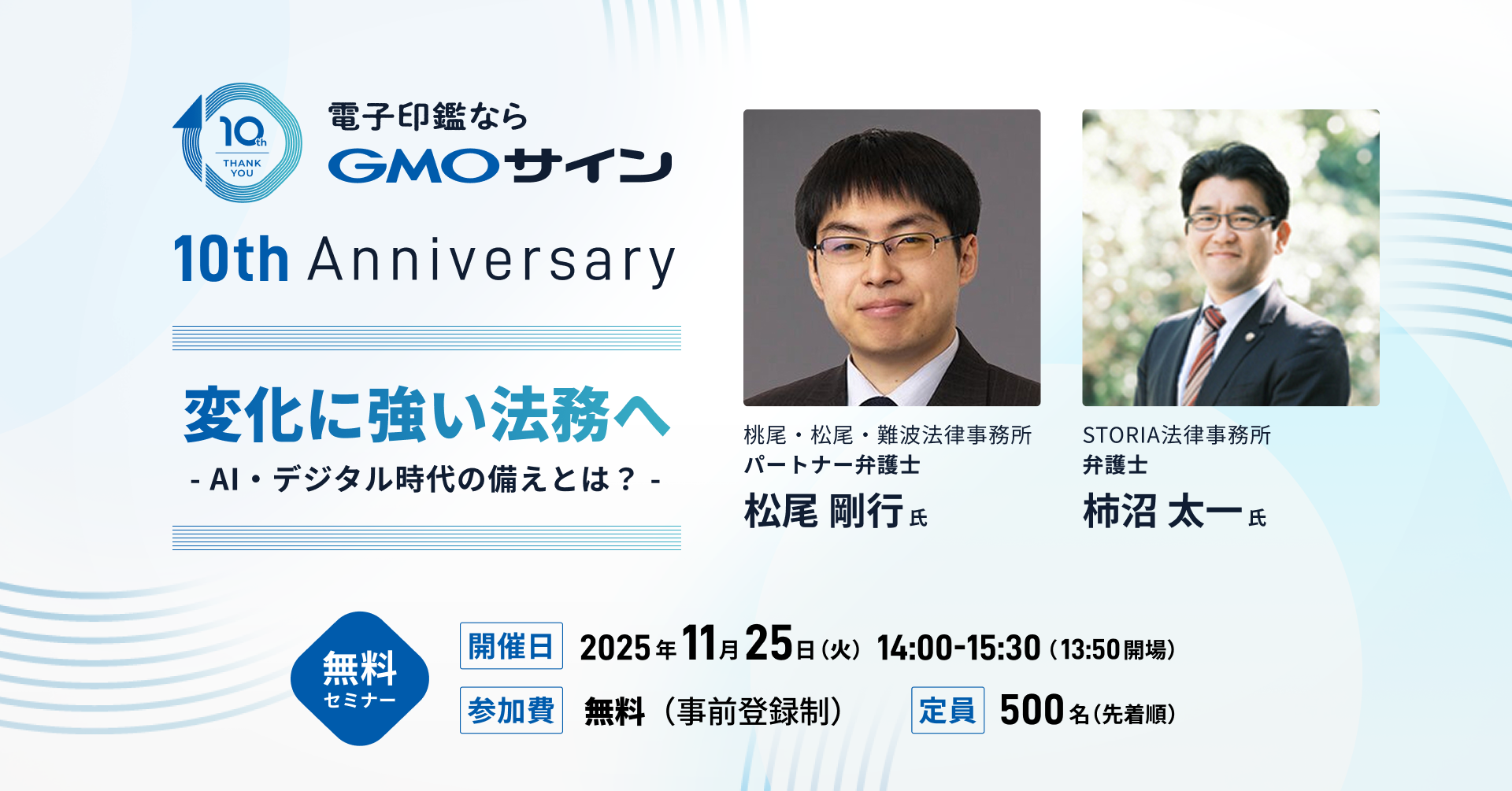 GMOグローバルサイン・ホールディングス株式会社(代表取締役社長:青山 満 以下GMOグローバルサイン・HD)は、「電子印鑑GMOサイン」(以下、GMOサイン)のリリース10周年を記念し、2025年11月25日(火)に、「バックオフィス部門におけるAIの活用とリスクマネジメント、今後の展望」をテーマにした無料オンラインセミナーを開催することをお知らせいたします。