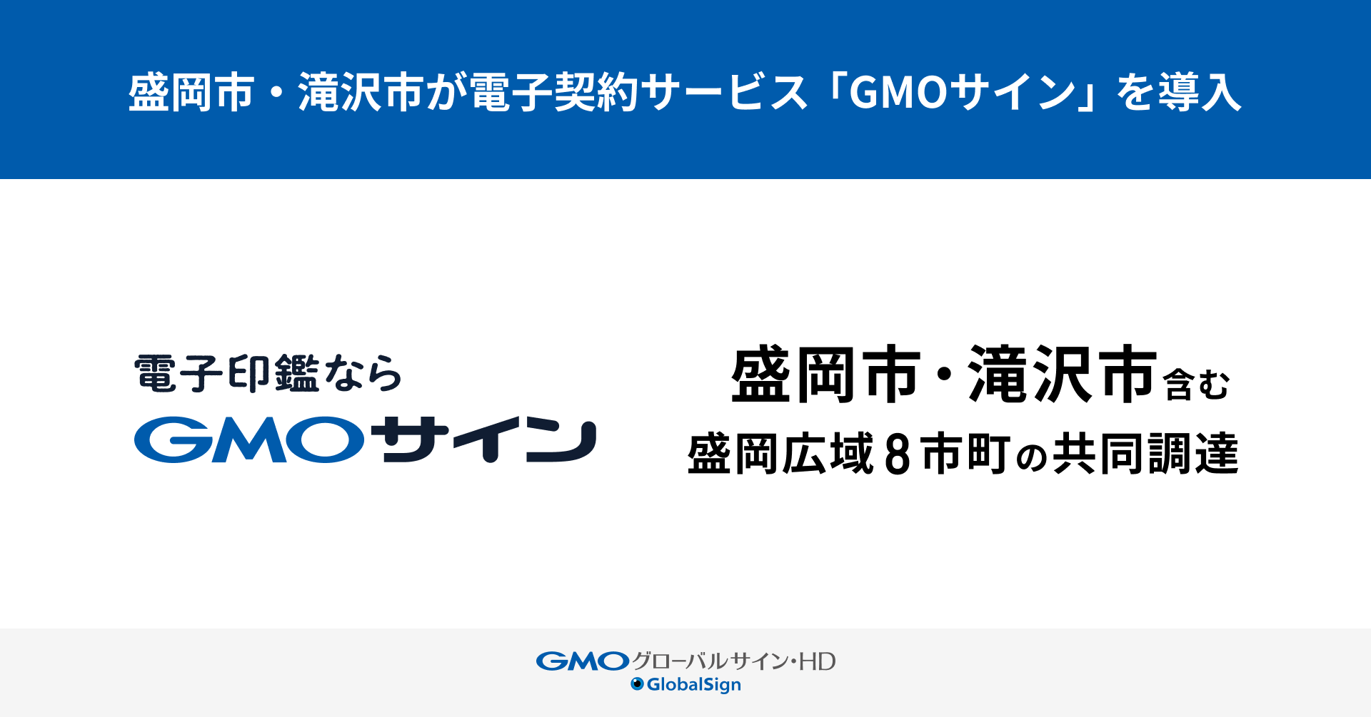 GMOグローバルサイン・ホールディングス株式会社(代表取締役社⻑:⻘⼭ 満、以下、GMOグローバルサイン・HD)は、自社が開発・運営する自治体向け電子契約サービス「GMOサイン行革DX電子契約」(以下、GMOサイン)が、岩手県盛岡市および滝沢市に導入されることをお知らせいたします。この決定は、「盛岡広域市町電子契約サービス導入及び提供業務委託」に基づく共同調達(※1)によるもので、まずは2026年2月より、盛岡市と滝沢市が「GMOサイン」を本格的に運用開始します(※2)。また今後は、当該共同調達の枠組みに参加している他の自治体でも、順次「GMOサイン」の導入が進む見通しとなっています。