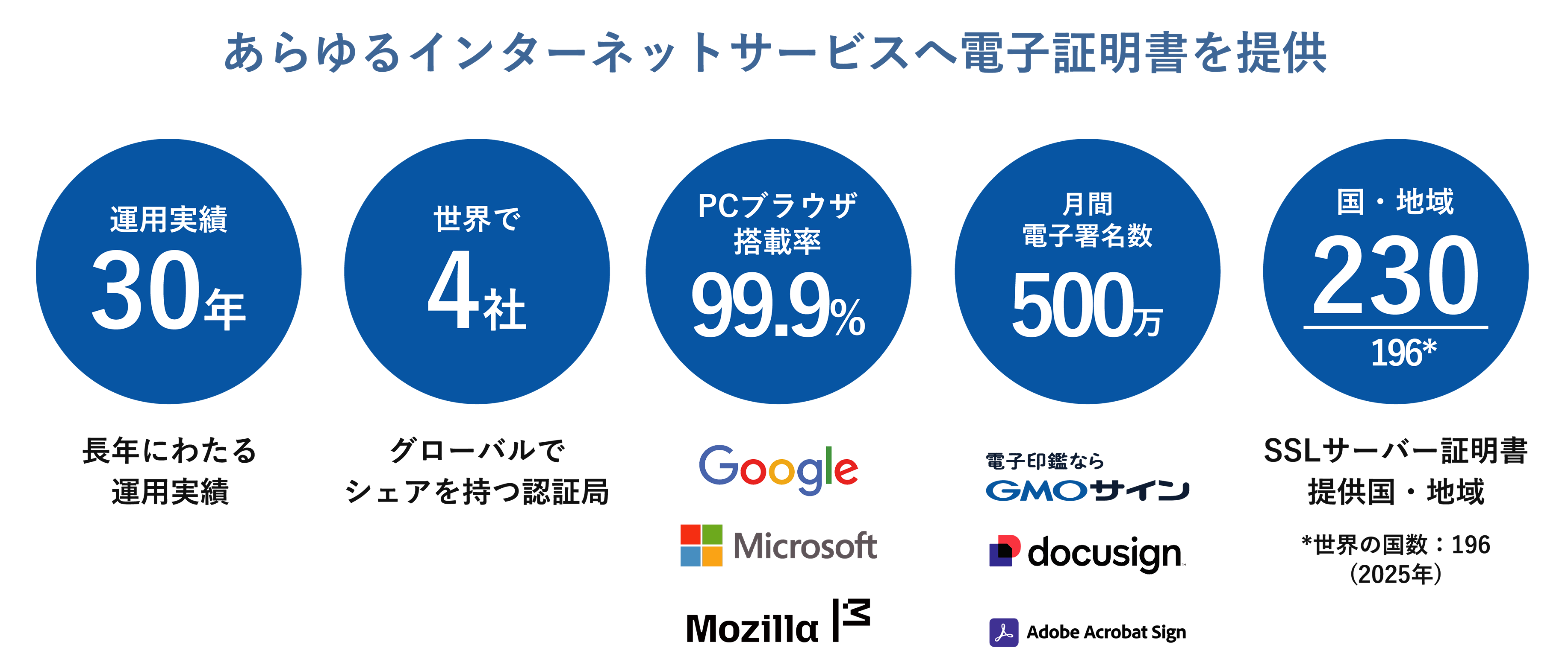 GMOグローバルサイン・HDは、インターネットやデジタル取引における「安全」と「信頼」を提供するITセキュリティ企業です。日本発の最上位認証局「GlobalSign」を運営し、世界11か国の拠点から各国の政府機関や企業に電子認証や電子署名の技術を提供しています。さらに、これらの技術を活用した国内シェアNo.1電子契約サービス(※4)「電子印鑑GMOサイン」を企業や自治体に提供し、安全な社会インフラを支えています。