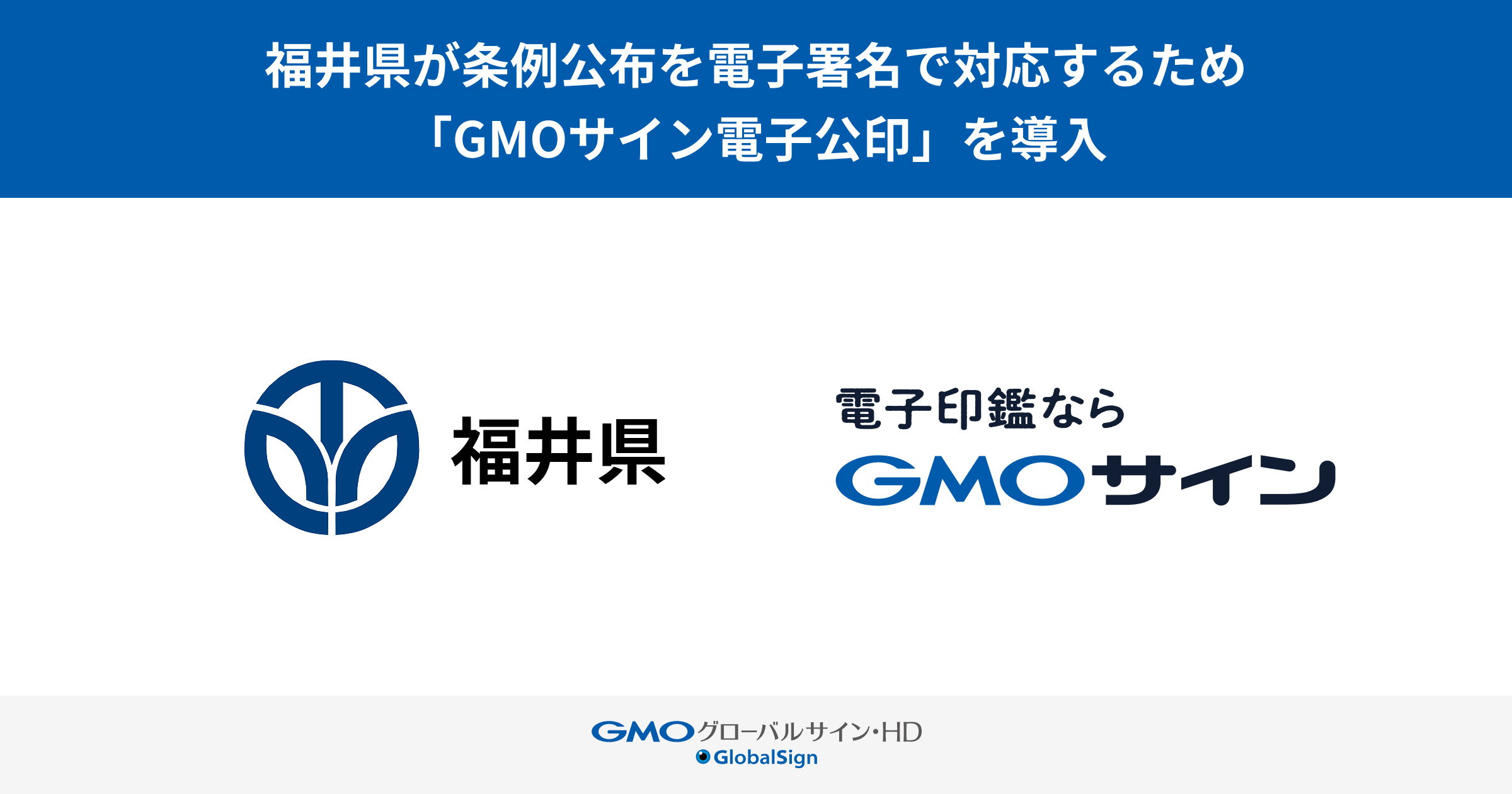 GMOグローバルサイン・ホールディングス株式会社(代表取締役社⻑:⻘⼭ 満 以下、GMOグローバルサイン・HD)の“条例公布のための首長署名のデジタル化”(※1)に対応するサービス「GMOサイン行革DX電子公印」(以下、GMOサイン電子公印)が、2026年3月に福井県(知事:石田 嵩人 以下、福井県)に導入されました。「GMOサイン電子公印」は、電子認証局が審査・発行する首長の職責付き電子証明書によって “条例公布のための首長署名のデジタル化”に完全対応(※2)するものです。福井県は、本サービスの活用を通じて、署名の電子化による行政業務の効率化に加え、自然災害等で知事が登庁できない場合も迅速かつ確実な条例公布を担保する運用体制を整えました。